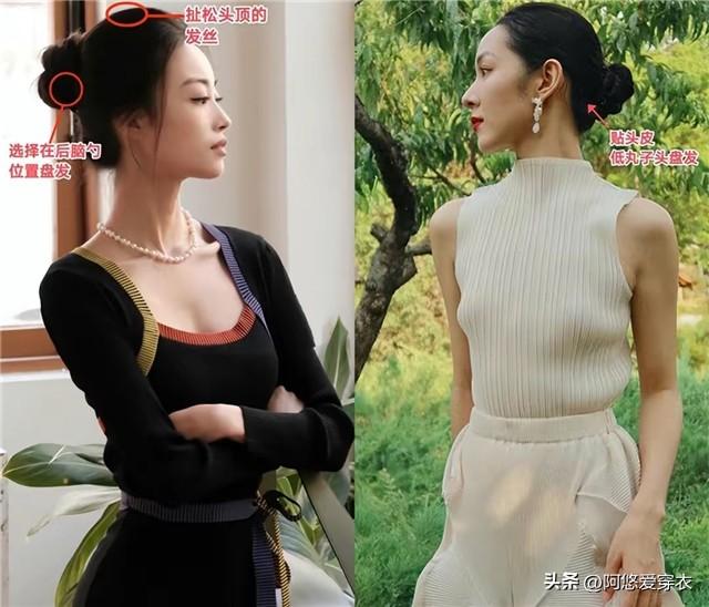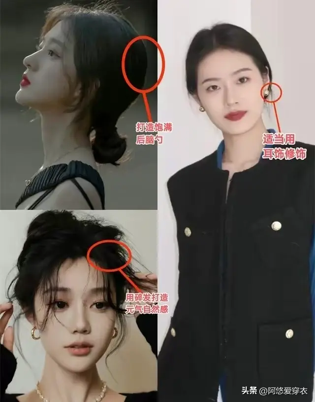 一般來說,圓臉型的女人可以選擇蓬鬆的古典扎髮,以拉長臉型;而長臉型的女生則可以選擇緊緻的古典扎髮,以縮短臉的長度,這款扎髮的特徵就在於頭髮高高盤起,顯得利落大方,再加上頭頂拉扯一些碎發出來打造出強烈的氛圍感,看起來慵懶還大方。