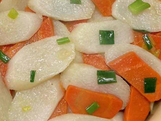 4、山藥和胡蘿蔔炒熟之後,撒上蔥花翻炒幾下即可出鍋裝盤開吃。