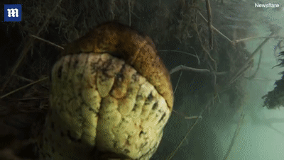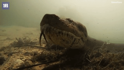 當巴托洛米奧在水下植物後面偷窺這條水蟒時,它開始對著鏡頭吐信子,還試圖用鼻子觸摸相機。