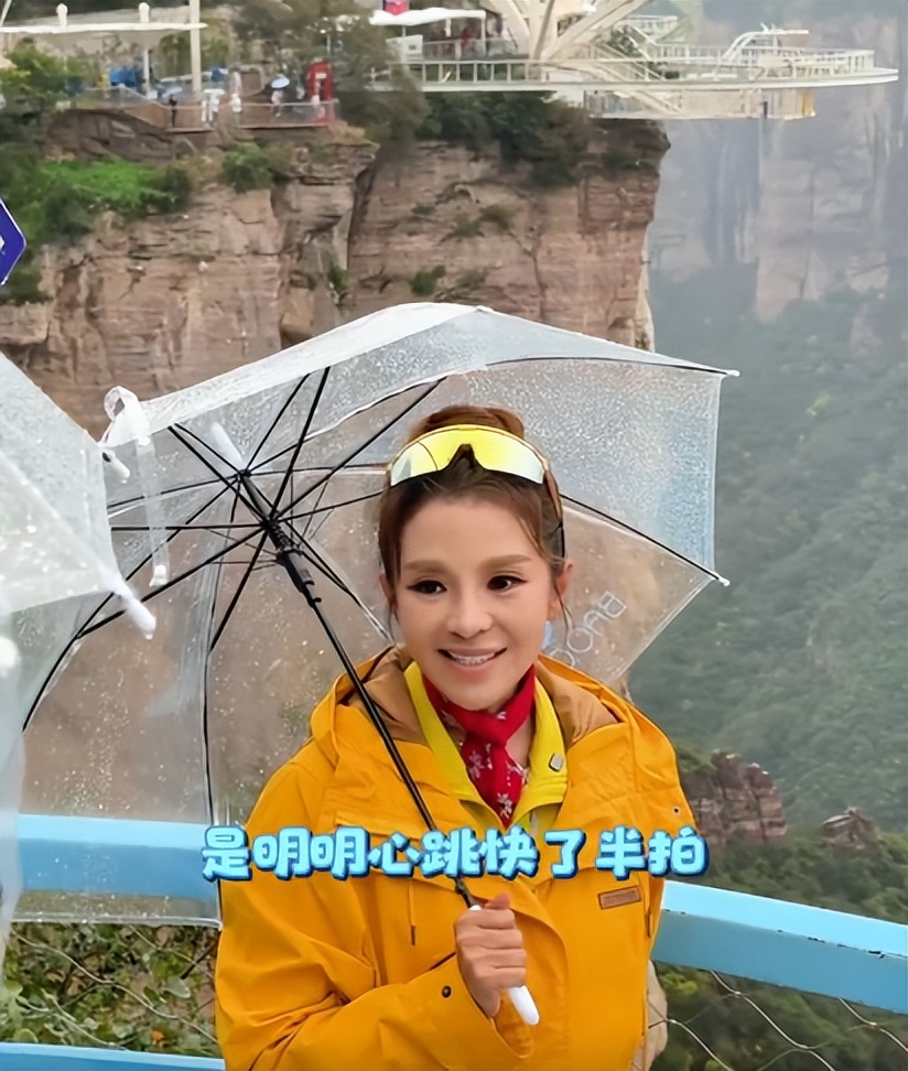 網友在崖天下景點偶遇她,她穿著黃色的衣服,跟同行的人邊走邊聊,臉上掛著輕鬆愉悅的笑。
