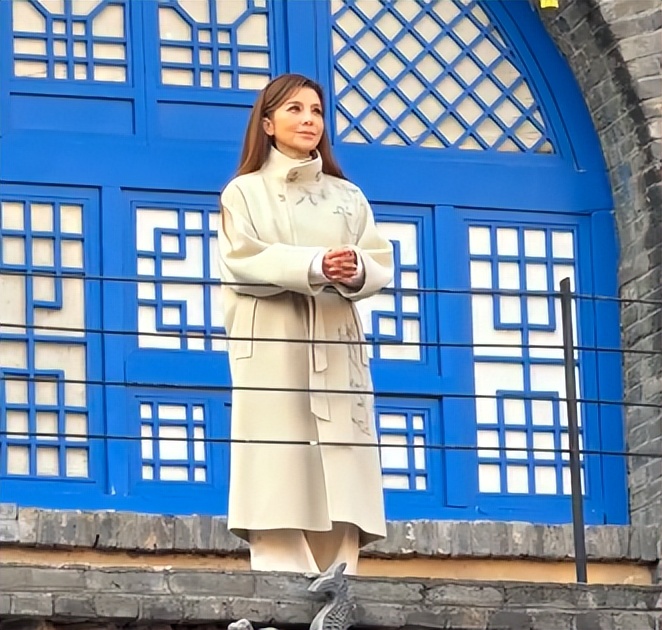 這次她罕見地沒有裝嫩,妝容清淡,頭髮就是簡單的披肩髮,配上白色大衣,氣質優雅,就像出自書香門第的大小姐。