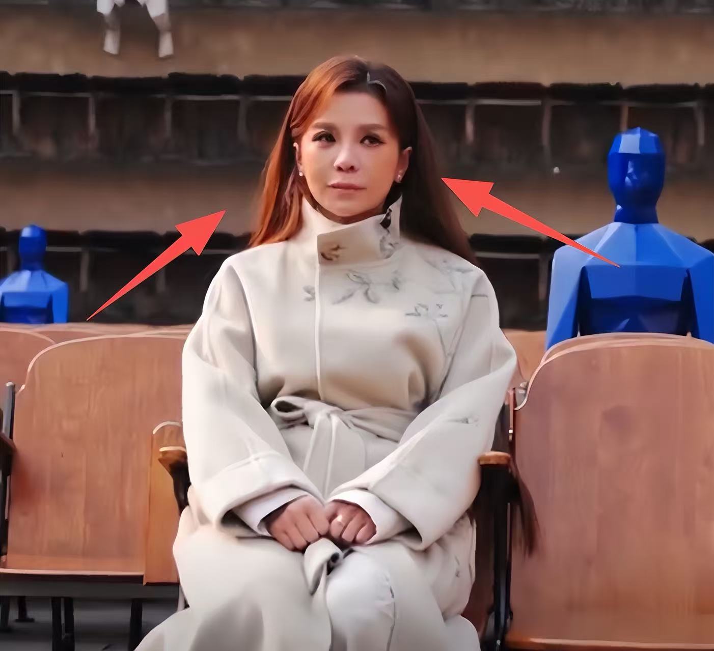 朱迅的臉頰兩側凹陷得很嚴重,像是做了手術沒恢復好一樣,臉上的褶子皺紋也越來越多,看起來比同齡人顯老一些。