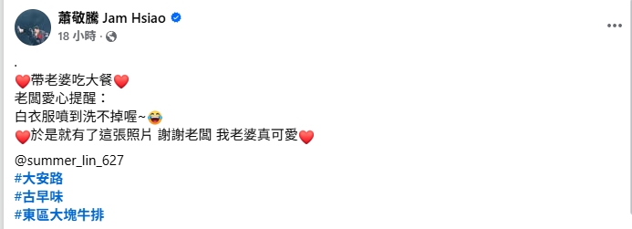 崩潰老公視角!38歲台灣歌王「把老婆拍成這樣」大讚可愛 網友笑翻「準備革命了」 Elmo 2025-08-13 檢舉 圖片來源:蕭敬騰臉書影片來源:VOGUE Taiwan互動太可愛了啦!資料來源:《ETtoday》 Advertisements 回首頁 2/2 Advertisements 猜你會喜歡 曾跟于美人搭擋!知名主持人「半夜持毒被逮」震驚演藝圈 落網才知「他曾拿下10座金鐘」:不是第一次 國道車禍!安迪女兒驚傳「遭聯結車拖行50公尺」 車身全爛「狀況曝光」 生不如死!47歲女星爆逼20億富尪「去買威爾鋼」 躺床上哀嘆:「太難受了」 編輯精選推薦 More + 空窗多年!68歲陳美鳳突羞認「身邊有個他」 40年前就認識「遭男方母親拆散」 22歲愛女病逝!資深男星「走不出喪女痛」留白長髮現身 掛骨灰項鍊「代女做1事」惹淚 旅美多年!資深女星「堅持落葉歸根」回國5天安詳離世 死前「砸600萬做1事」眾人淚目 再婚2年了!43歲李燕突喊「當媽媽實在太辛苦」 認「已經有愛的結晶」:最完美的幸福❤️ 台灣大咖病逝「享壽83歲」!周遊告別式痛哭「認婚內出軌」:兒子很恨我... 24歲兒失明!于美人爆「他在飯店掃廁所」維生 不盼紅包只求「別再花我的錢」 以為只是小感冒!本土女星悲痛證實「他併發肺炎過世」 一度淚灑現場「後悔同意插管」 本土劇女星生了!7年前凍卵「終於來到我身邊」 歌手尪嗨喊:生個足球隊 功德圓滿了!台語歌后「悲曝他離世」享壽95歲 淚喊:去當快樂的神仙吧... 晚年兒孫滿堂!73歲影壇大哥「拄拐杖現身」腳步蹣跚 兒子「全程攙扶不喊累」網羨:又帥又孝順 離婚11年!洪榮宏愛女結婚「終破冰前妻」 「2爸爸牽她進場」催淚畫面曝 相差18歲!58歲康康自爆「與老婆分房12年」驚呆眾人 提到沈玉琳「坦言罹同1病」:必須警惕... 台語歌后慟別摯愛!告別式上認「早隱瞞病情」 道歉哭喊:原諒我簽放棄急救 快訊/曾叱吒政壇!蔡英文「最信任的她過世」 死訊被證實「已舉辦告別式」 趕在40歲前閃婚!八點檔女星「宣布嫁給他」 尪驚人身分曝「媒人是柯叔元」 曾比江蕙紅!台語歌后「爆未婚生子」遭指指點點 「2次手術害癱瘓」72歲近況曝 婚變尪落跑!單親媽「獨扛千萬債養孩」到處躲黑道 「一開口驚艷眾人」熬成台灣歌后 慘遭飛車拖行!八點檔男星「臉全磨爛」驚悚畫面曝 目睹女星「崩潰嚇哭」頻發抖 快養不起小孩!本土男星「開計程車、斜槓房仲」 突宣布「離開台灣」:演藝圈沒工作 85歲失智父身亡!林葉亭突宣布「皈依佛門」 遇大師「開示一番話」忍不住淚崩 全遣送中國!台灣873名詐騙犯慘了「外交部出面回應」 模範孝子!比莉罹癌「兒白天工作、晚上睡醫院」 坦言「一滴淚沒掉」:媽媽可以我也可以 最新/賈靜雯深夜慟曝「她已離世」 淚PO合照喊:真的好愛你... 快訊/才過1年!賴佩霞驚傳「他不幸身亡」急飛美國奔喪 臨終前「女兒陪在身旁」 當年親吻1歲嬰!42年後「對方竟成巨星」同框劉德華 「超高顏值如兄弟」粉絲喊:真的差19歲?
