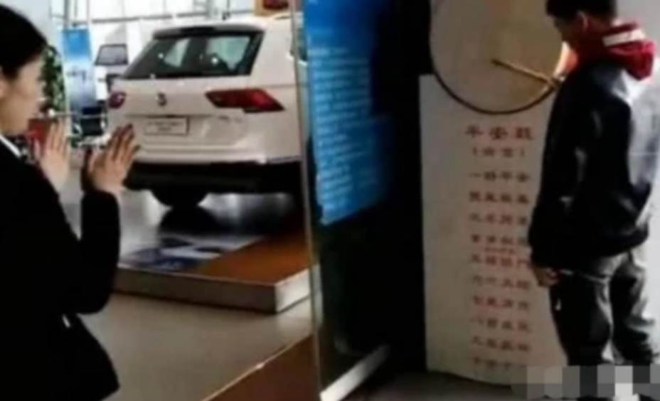 在店員的要求下,宋先生要手提大鑼,著眾多工作人員以及看車的人朗讀一段吉祥話,宋先生感到自己被戲耍了,一環套著一環讓自己配合他們完成活動,於是將身上的大紅花往地上一甩,直接拿了車鑰匙準備走人。