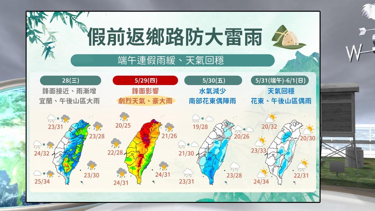 端午連假天氣方面,30日鋒面將南移至巴士海峽,各地天氣逐漸好轉,僅南部地區清晨至上午仍有零星降雨機會。31日全台轉為晴朗炎熱天氣,6月1日則為晴時多雲,午後局部地區可能出現雷陣雨。展望未來一週天氣,6月2日至3日台灣籠罩在暖氣團影響下,各地將出現如盛夏般的高溫,午後局部降雨機率提高。6月4日第5波梅雨季鋒面將再度南下,為台灣帶來明顯降雨。6月5日至6日鋒面持續南移,各地天氣轉好,但午後仍有局部短暫雷陣雨的可能。