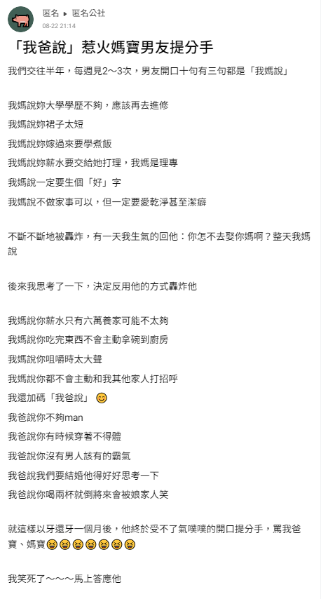 到後來她更加碼搬出「我爸說」:「我爸說你不夠man」、「我爸說你有時候穿著不得體」、「我爸說你沒有男人該有的霸氣」、「我爸說我們要結婚他得好好思考一下」、「我爸說你喝兩杯就倒將來會被娘家人笑」。就這樣以牙還牙一個月後,男友終於受不了、氣到開口提分手,並且大罵她是「爸寶」、「媽寶」,讓原PO除了爽快答應分手之外,內心更是暗自竊笑不已XD