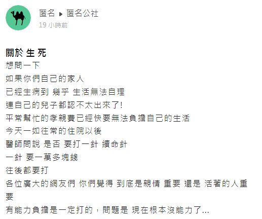 據《TVBS》報導,最近有位男網友「爆料公社APP-匿名公社」表示,自己的親生父親重病多年,狀況已無法自理,甚至就連自己這個親生兒子也認不得。平時都有給父母孝親費的他,最近被醫生問到「是否要打續命針?一針要一萬多元」並嚴肅表示,往後都要繼續打。
