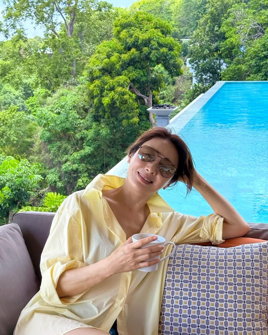 根據《中時新聞網》、《噓!星聞》報導,近日黎姿於社群平台曝光多張出遊照片,不僅在渡假村品嚐美食,更背對著戶外泳池展現素顏真容,身穿米黃色襯衫配上短褲,長髮隨性盤起,雖以太陽眼鏡遮住雙眼,但臉部肌膚緊緻無比,搭配明顯酒窩與淺淺笑容,凍齡到完全看不出年紀。