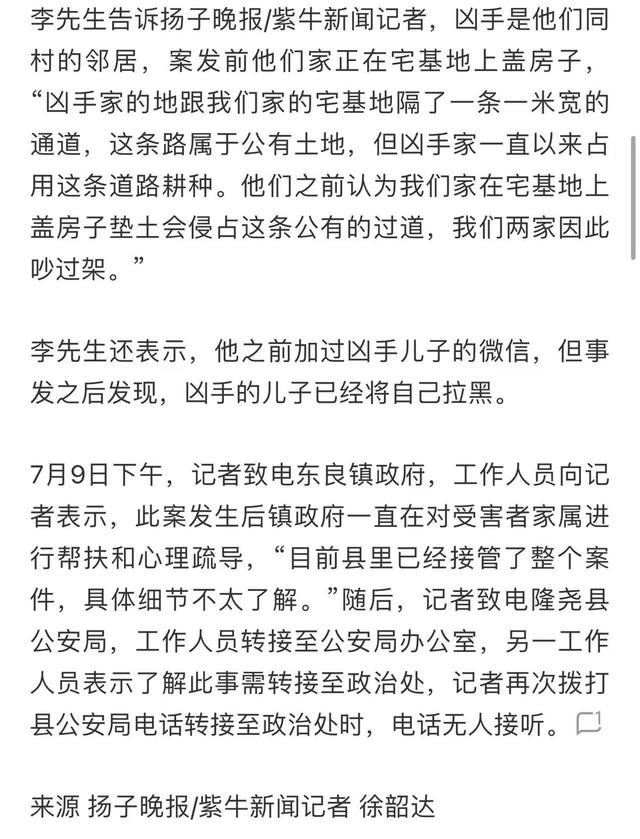 所以李先生就認為,肯定是鄰居對這件事情懷恨在心,這才對他們家痛下殺手。他之前還有兇手兒子的微信,但現在卻被對方直接拉黑。對於此事,當地政府工作人員進行證實,對方表示確有此事,現在不停在做安撫和心理疏導工作,但這樣的仇恨,怎麼可能疏導的了。
