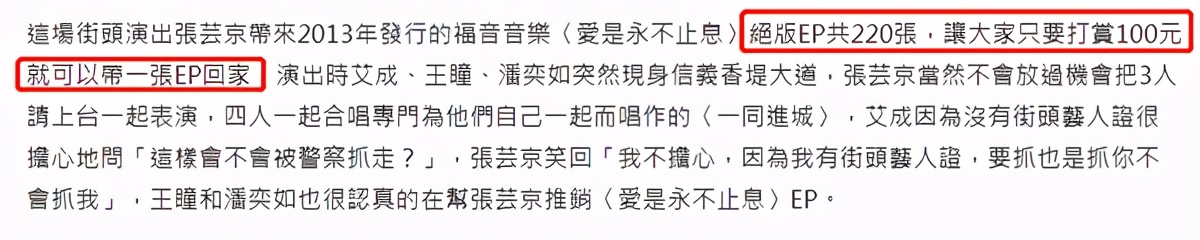2月21日,張芸京在街頭擺攤賣唱,她一天之內連唱2場不停歇,全程共3.5個小時。從照片來看,張芸京和好友一起倒是樂在其中,手抱吉他在路邊就能開唱。