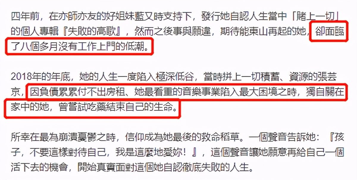 在張芸京做街頭藝人賣唱之前,她曾經歷了人生中最黑暗的時期。張芸京曾發長文自曝低潮期有長達8個月沒有工作,導致負債纍纍付不起房租,最後甚至嘗試吞葯輕生。
