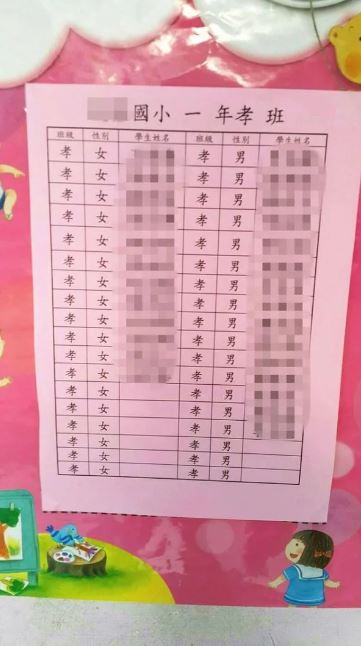 求學階段,學校班級通常除了會以數字來編排,也有使用「甲乙丙丁」、「忠孝仁愛」等方式。網路上就流傳著一張某小學的班級名冊,校方在編排學生名單時似乎疏忽、沒注意到排版,導致在「孝」班的班級名冊上,所有學生都紛紛變成了「孝男」、「孝女」,讓家長們直呼晦氣、簡直太不吉利了!