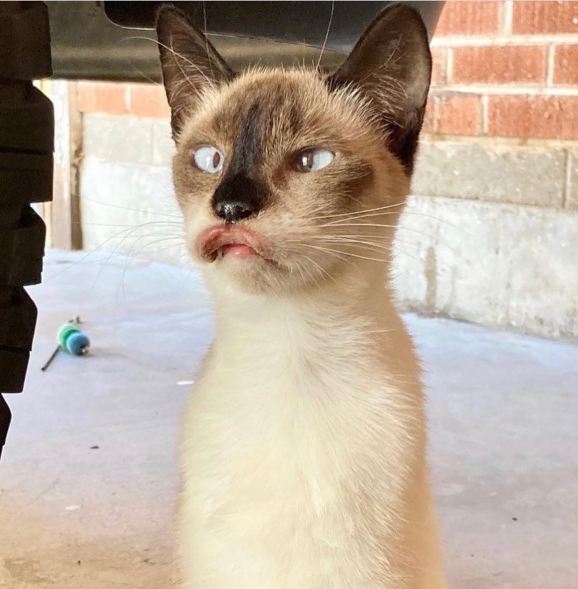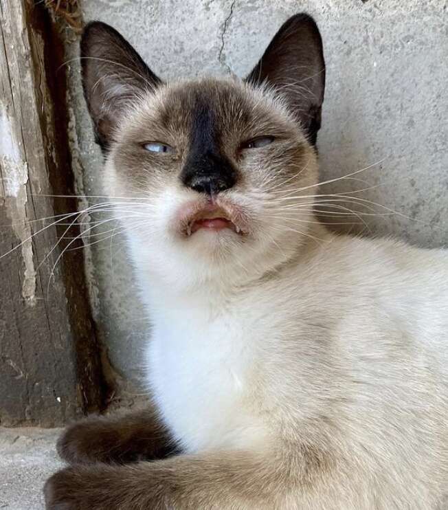 貓咪被取名為珊姆(Sam),當基地負責人初次見到這隻鬥雞眼又嘴唇腫脹的暹羅貓時,以為牠可能是有天生殘疾,因為牠看起來似乎並沒有特別感到痛苦不舒服,牠只是和其他貓咪一起來基地這裡吃飯;儘管如此,牠還是被送到獸醫院進行檢查。