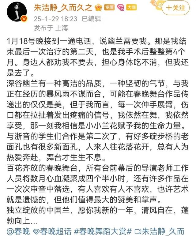 今年1月,朱潔靜曾在春晚舞台上表演舞蹈《幽蘭》後回應病情。