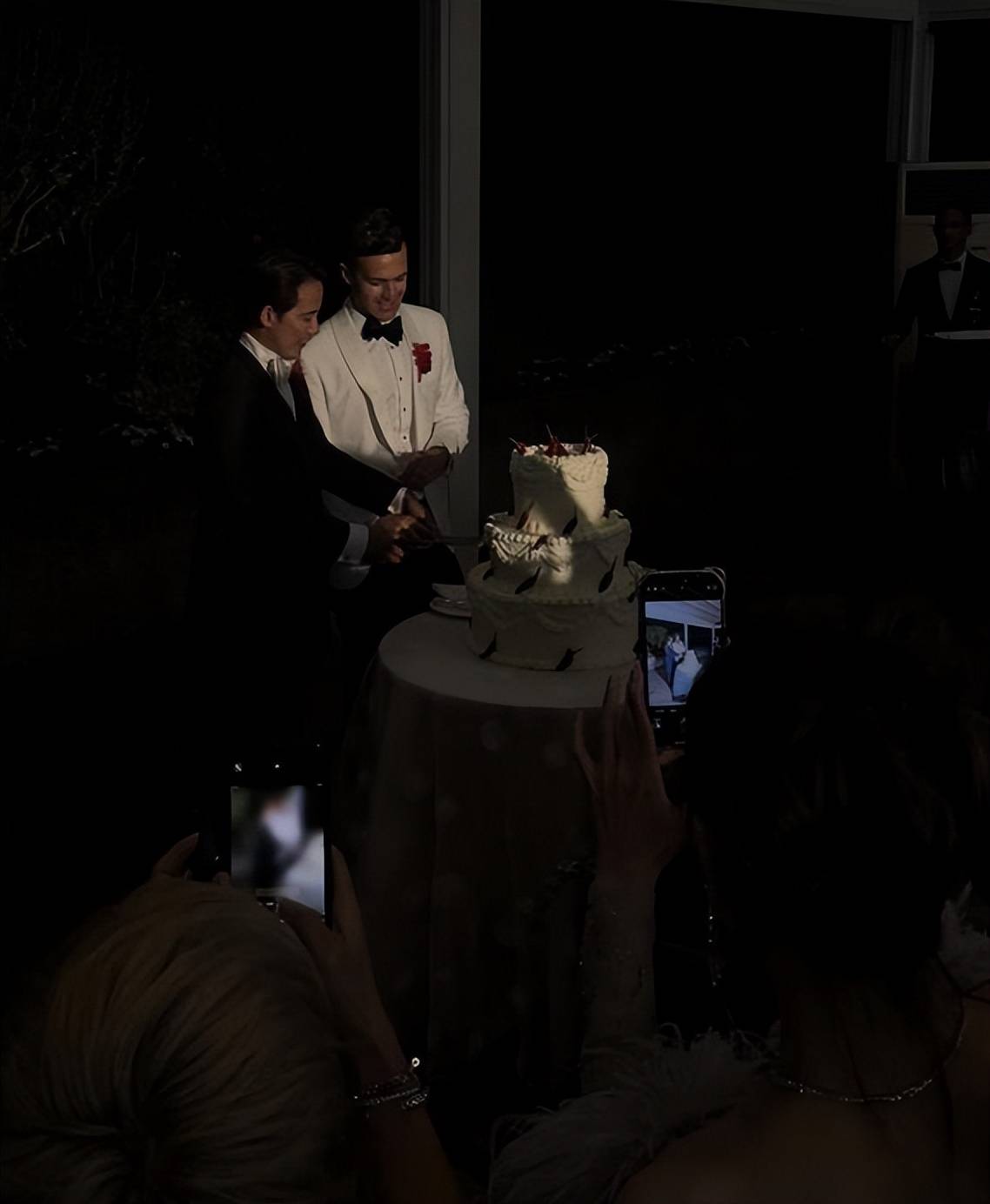 晚上的晚宴移到了酒店裡面,那個宴會廳裝修得很華麗,歐式風格,天花板上有壁畫,水晶燈,長桌宴的形式,桌子上擺滿了鮮花和燭台,氛圍感確實很足,鍾利華換了黑色禮服出來迎賓,兩個人還在台上切蛋糕,他的義大利丈夫還發言感謝來賓,整個流程跟傳統婚禮沒什麼區別。