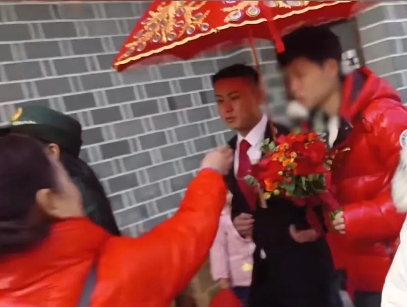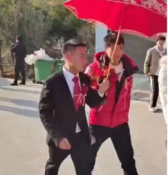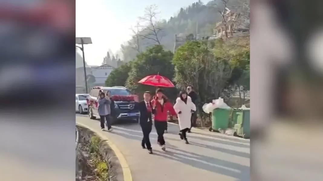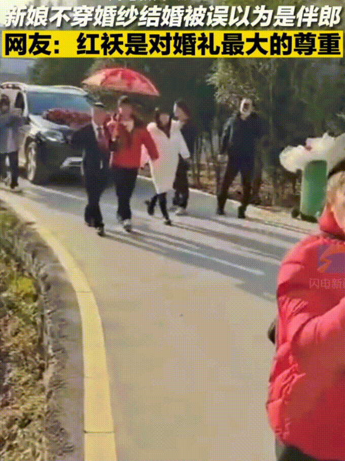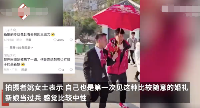 在網傳影片中,新娘沒有穿婚紗,留著短髮,一身紅棉襖,中性打扮,英氣十足,走路健步如飛,新郎則在一側撐著喜慶大紅傘,不知情的人一時間竟然難以辨別,這是伴郎還是新娘?有知情人稱,新娘是當兵的,不愛穿婚紗。