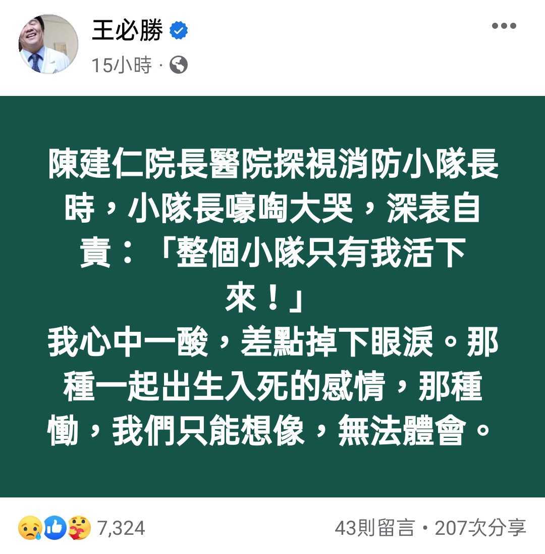 行政院院長陳建仁昨日下午前往醫院探視小隊長陳文川,衛福部次長王必勝透露當時情況,只見小隊長嚎啕大哭,情緒潰堤自責:「整個小隊只有我活下來。」讓在場所有人聽了心中一酸,眼淚也差點跟著掉下來,心疼表示:「那種一起出生入死的感情,那種痛,我們只能想像,無法體會。」陳建仁晚間也在臉書沉痛說明:「我們會提供家屬最即時的協助;並盡速啟動事故調查程序,釐清事故發生原因,確保這樣的事件不會再度發生。」望逝者安息、家屬節哀。