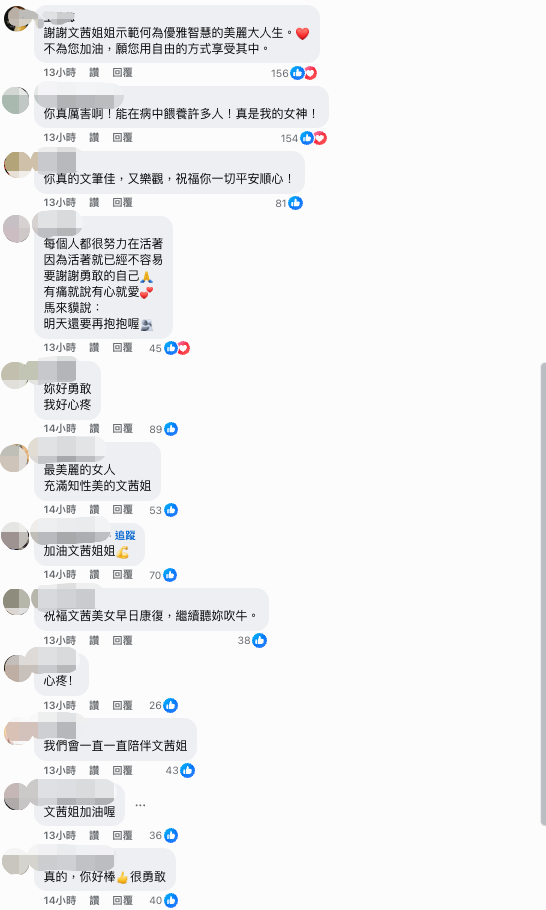 面對病魔,她展現出驚人的毅力,持續透過社群平台與外界保持聯繫,分享自己的心路歷程。網友們也紛紛在留言區為她加油打氣,讚揚她是個勇敢的鬥士:「謝謝文茜姐姐示範何為優雅智慧的美麗大人生」、「能在病中餵養許多人!真女神!」、「你是我看過最知性有才華又滿腔熱血的人!」最新曝光曝光引來大批網友祝福她早日康復。