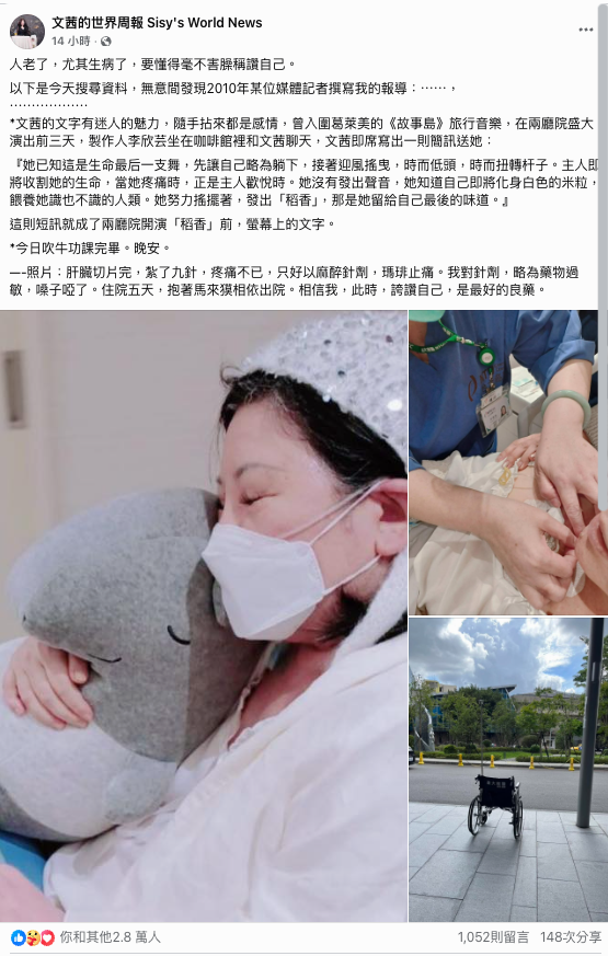癌擴散又爆併發症!67歲陳文茜「又住院5天」 肝臟切片「痛到靠嗎啡苦撐」病容粉絲看哭