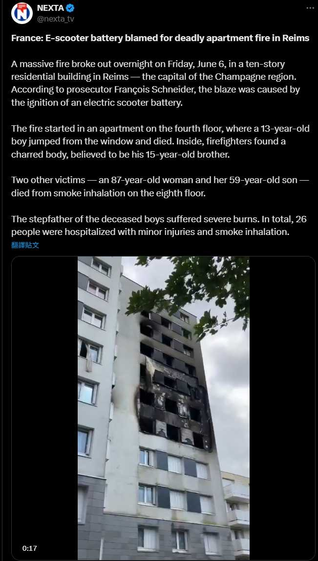 根據《美聯社》報導,一起令人心痛的住宅火警意外,在法國香檳區城市蘭斯造成4死28傷的慘劇。一台電動滑板車的鋰電池竟在深夜時分自行燃燒,引發一發不可收拾的火勢。