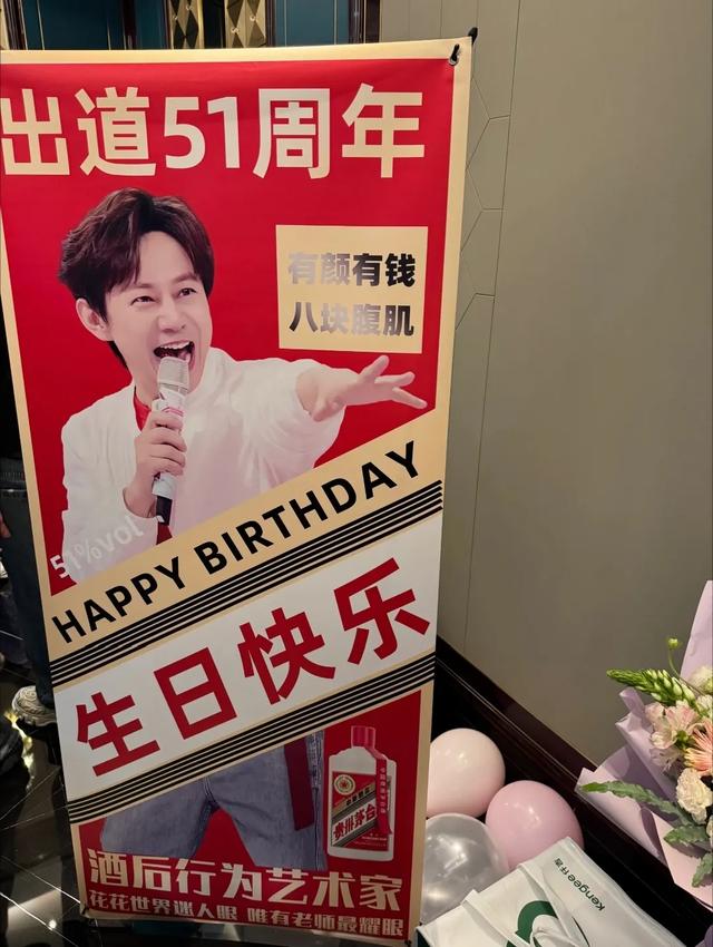 現場準備的慶生海報也很有巧思,「八塊腹肌」簡直要誇進何老師心坎裡,看看這海報的設計,私下的何炅應該是喜歡小酌一杯的。