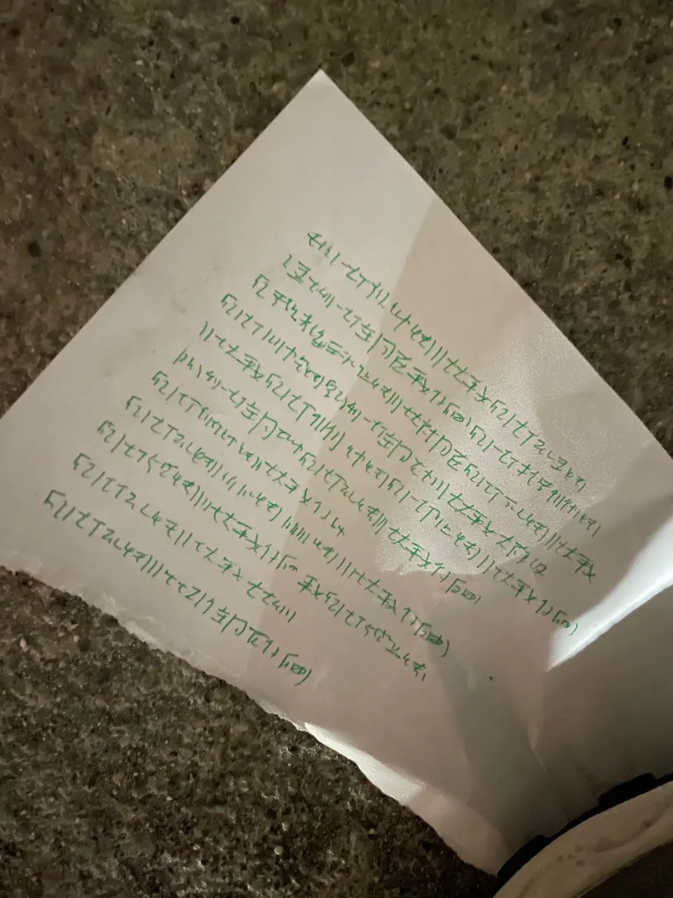 原PO在Dcard發文提到,她的機車被擺放一張神祕紙條,而從紙條中可見,上面佈滿難以理解的文字,字跡歪歪扭扭,完全不知道是哪國語言,這也讓她不禁發毛,「拿起來後完全不敢摸,我放在地上拍。請問這是什麼?看起來很可怕」。