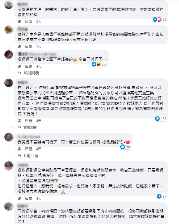 許多網友也紛紛替司機喊冤「我覺得對生理上的需求(吃飯上洗手間),大家要相互的體諒與包容,才能讓這個社會更加和諧」、「我覺得不要難為司機了,再辛苦工作也要吃飯啊~多點體諒吧~」、「司機很辛苦,有時候跟本沒時間吃飯都要餓到下班才有時間吃,很多司機都搞到常期沒好好吃飯導致胃痛,你們一投訴要害司機扣到好幾天的薪水,請大家體諒司機的辛苦!」、「有些線路起點及終點沒有吃的可以買,只能在中途買,而且也不是所有的便當店都有讓司機發車前先訂餐,開長途車的總會有生理需求吧....」。