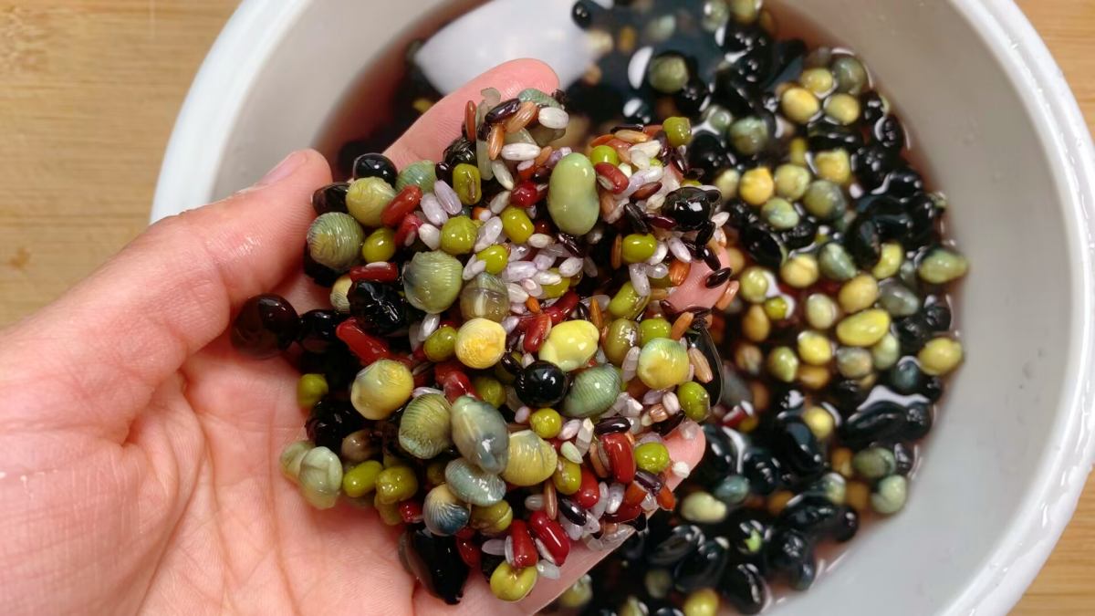 具體做法:1、準備2兩黑豆、黃豆、綠豆、紅豆和3兩三色糙米,先把它裡面破殼的及癟裂的挑出來,然後再用乾淨的清水多衝洗幾遍,最後再用清水浸泡半個小時,浸泡可以把所有的豆類外殼泡軟,在煮粥的時候能夠很快的煮熟,煮出來特別的粘稠。浸泡后的豆子會比原來大一倍,如下圖!