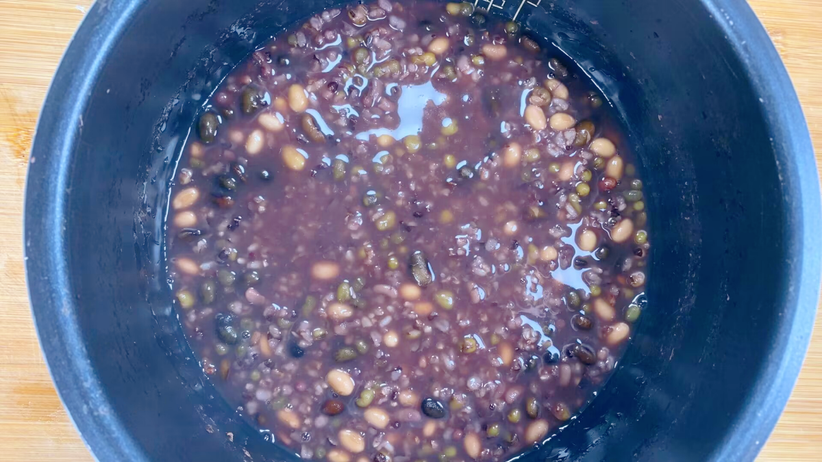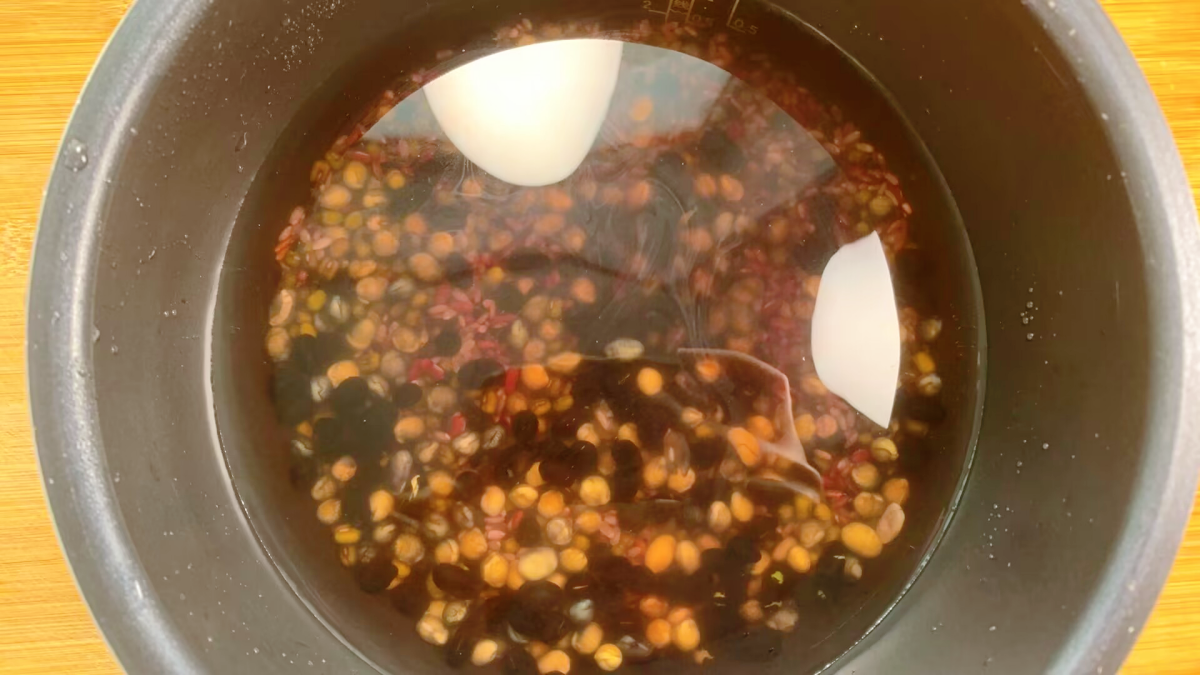 2、把浸泡后的豆子倒入電飯煲內或者是煮鍋內,裡面加入沒過豆子三分之二的冷水,如果是電飯煲摁煮飯鍵煮30分鐘。如果是煮鍋,先開大火煮開後轉小火煮1個小時