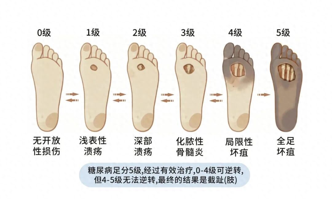 當足部因為各種原因出現傷口的時候,糖尿病所導致的末梢動脈血管病變會阻礙正常的血液循環,傷口變得不易復原,不僅可能出現久治不愈甚至還會「變本加厲」。加之糖尿病患者免疫力差,也更容易受到病菌的感染,這就形成了糖尿病足。從這個層面上來說,我們可以認為雙腳是血糖的「檢測儀」。