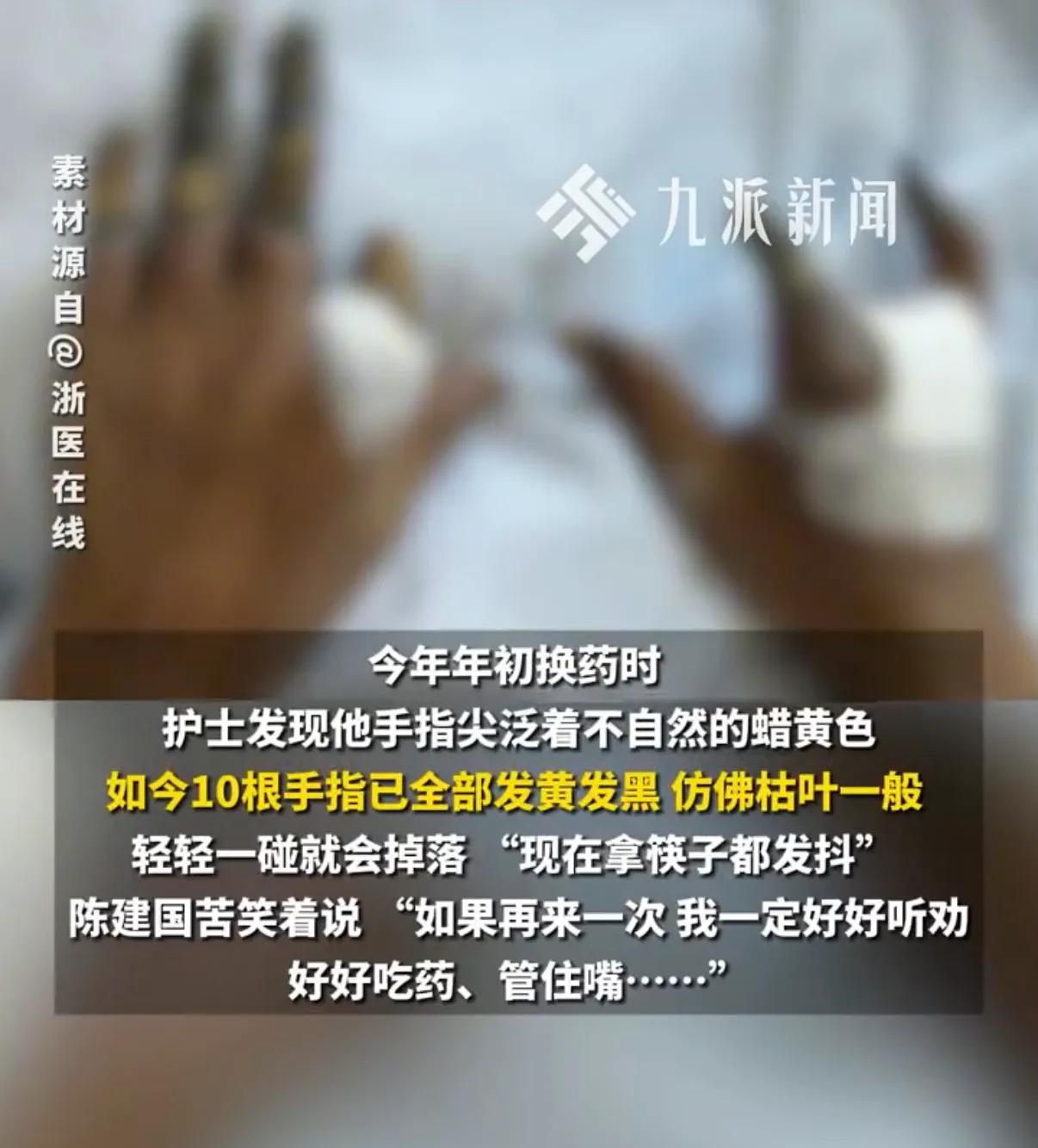 10月14日,「浙醫在線」公眾號發布了「男子患糖尿病剪指甲不小心剪破拇趾,不到兩年竟切除十根腳趾」的病例。