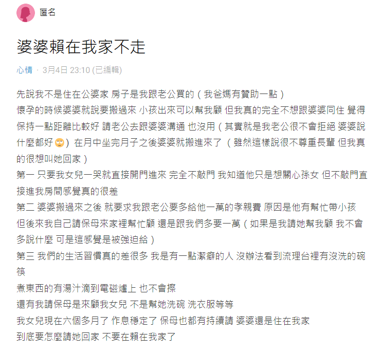 後續原PO也提到,有再請老公去跟婆婆溝通,但婆婆的回覆是已經住習慣了,相比原先住苗栗、原PO家這邊附近生活機能比較好,且認為兒子的家她也有資格住,後來甚至還直接問原PO是不是不歡迎她來住,「她可能覺得我不會直接說,但我就是很老實的跟她說我不想跟她同住,我說完之後,她就開始哭說兩個兒子都不要她...」,原來前幾年原PO大伯大嫂生小孩時,婆婆也是搬進他們家,後來同樣是嫂嫂也受不了而把婆婆趕走,「反正婆婆最後的意思就是不願意搬走。」
