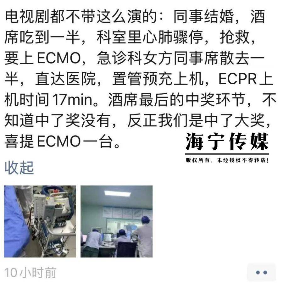 10分鐘後,海寧市人民醫院ECMO團隊到達醫院,大家分工合作、緊密配合,立刻精準定位,開始穿刺;17分鐘後,ECMO成功轉機。