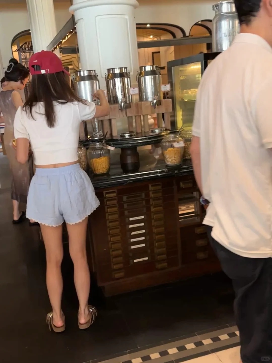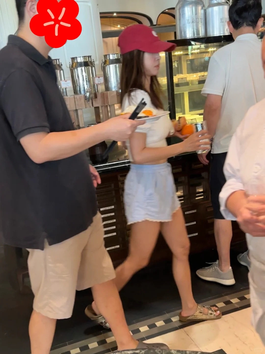 隔天早晨,原PO在飯店餐廳又遇見了蔡依林,只見她以簡約白色T恤配上水藍色短褲,展現出清新悠閒的度假風格,即便戴著帽子想要低調,但仍舊散發出閃耀明星光環,成為餐廳中最引人注目的焦點。