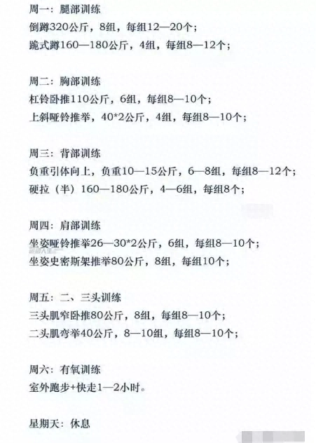 為此,他制定了一套非常嚴苛的計劃,一周一個循環,身體各個部位都要虐遍。
