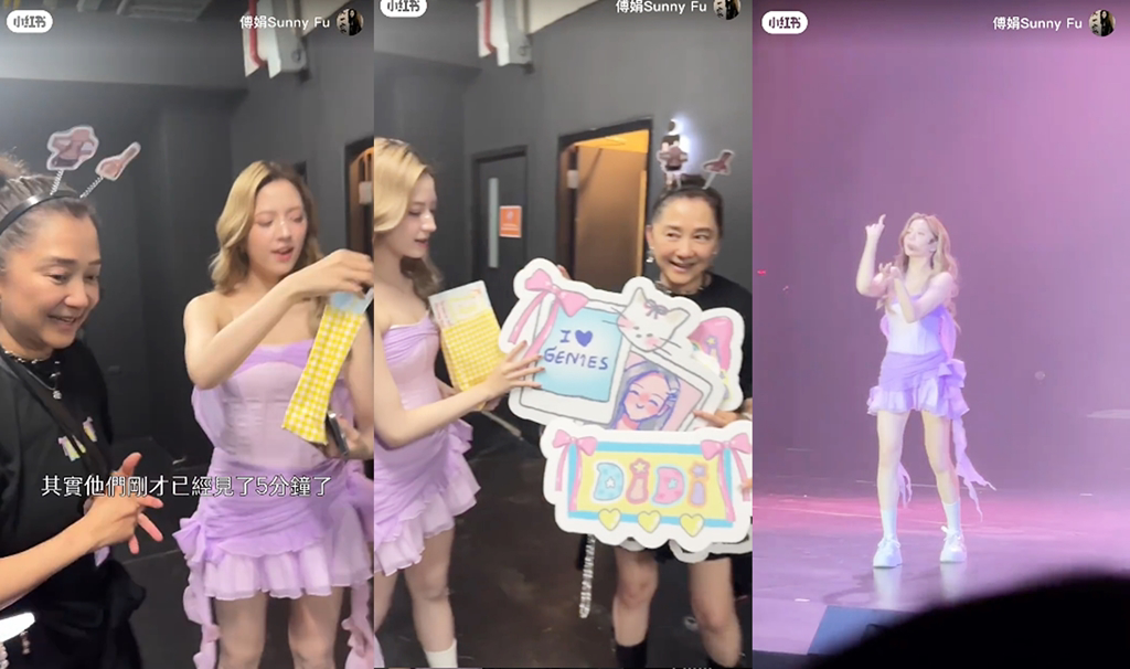 傅娟近日在小紅書曬出一段影片,只見她戴著髮箍、手拿應援板闖入明星後台,當鏡頭一轉到明星本尊,眾人才驚呼原來是小女兒歐陽娣娣,「人生第一次粉絲見面會,Gen1es第一次曼谷粉絲見面會,我是娣娣的粉絲小太陽」。值得一提的是傅娟手中的應援物正是二女兒歐陽娜娜的手工製品,包含扇子、髮箍,她也帶著親友一起到場力挺。