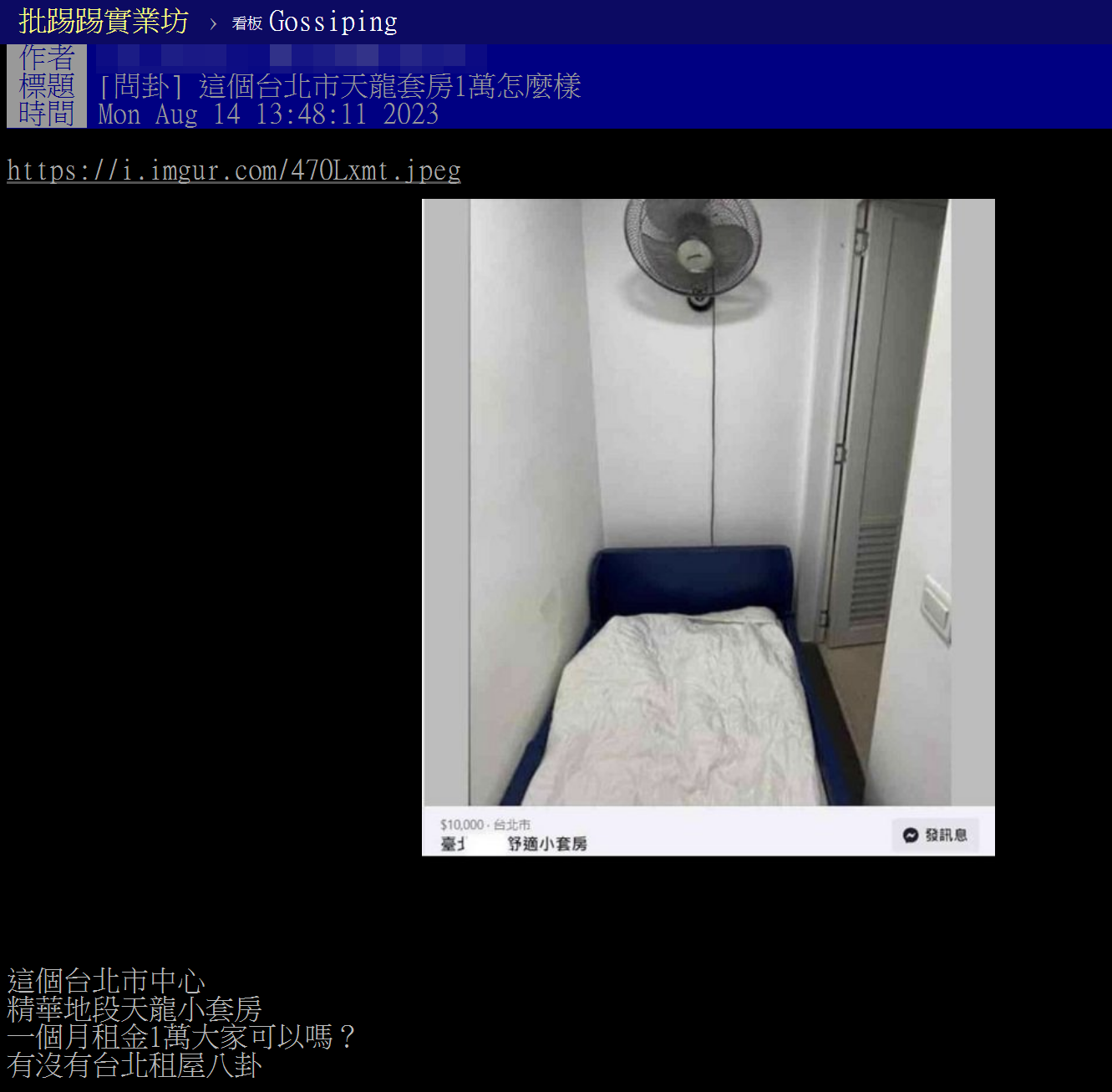 原PO稱,該租屋物件是位於台北市中心、精華地段的「天龍小套房」,並好奇詢問:「一個月租金1萬大家可以嗎?」網友們大多都看呆了:「101裡面可以,其他不行」、「看地點,旁邊就大安森林公園那就值得,去跑步紓壓回家就睡覺」、「這在信義區可以,其他吃屎」、「離廁所好近」、「慘,香港劏房化」、「今日香港 明日台灣 提早達成」、「監獄單人間嗎」、「住這種的不如去住qtime」。