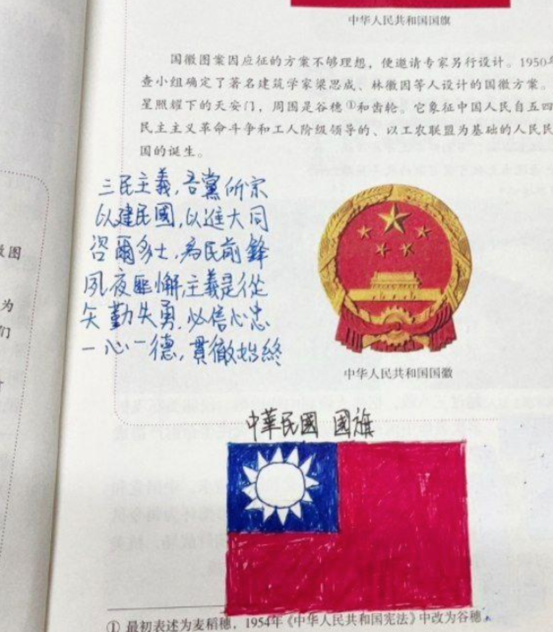 從該照片可以看到,這張中華民國國旗相當明顯,且國中生更用藍筆寫下國歌,「三民主義,吾黨所宗;以建民國,以進大同。咨爾多士,為民前鋒;夙夜匪懈,主義是從。矢勤矢勇,必信必忠;一心一德,貫徹始終」,右下角更寫下,「三民主義統一中國」,與大陸目前的政治方針大相徑庭。該帳號更配文,「我今天被叫到學校了,老師說我兒子在書上這樣亂塗亂畫,這是什麼意思」,引發關注。