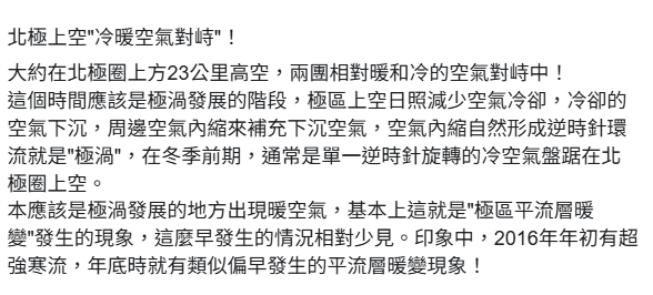 他進一步表示,冬季初期通常會有單一的冷空氣團以逆時針方式盤旋在北極圈高空,然而現在極渦應該發展的區域卻出現了暖空氣團,這基本上就是「極區平流層暖變」的跡象。鄭明典特別強調,這種現象如此早出現的情況並不常見,他印象深刻地記得,2016年初發生超強寒流時,在前一年底就有類似提早發生的平流層暖變狀況。