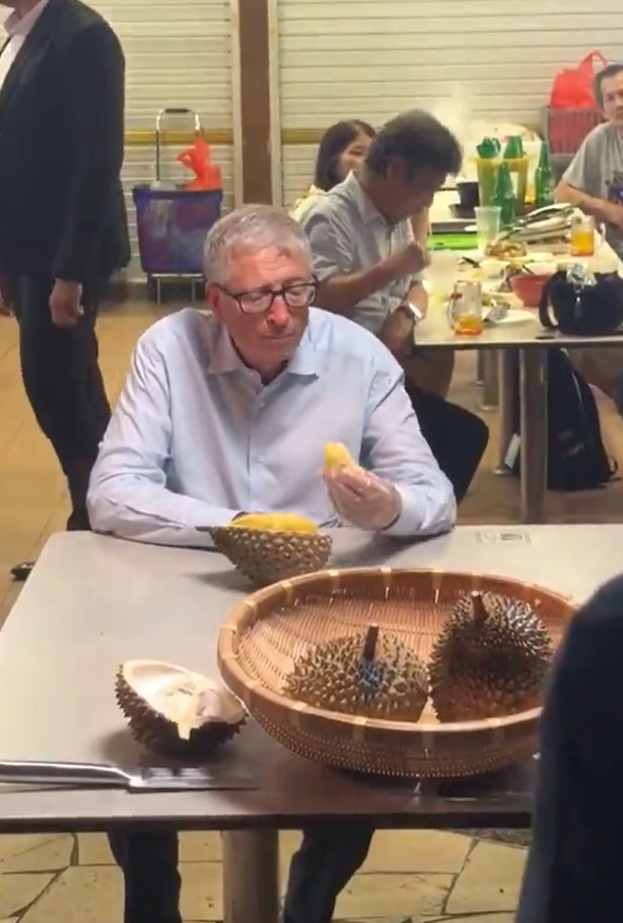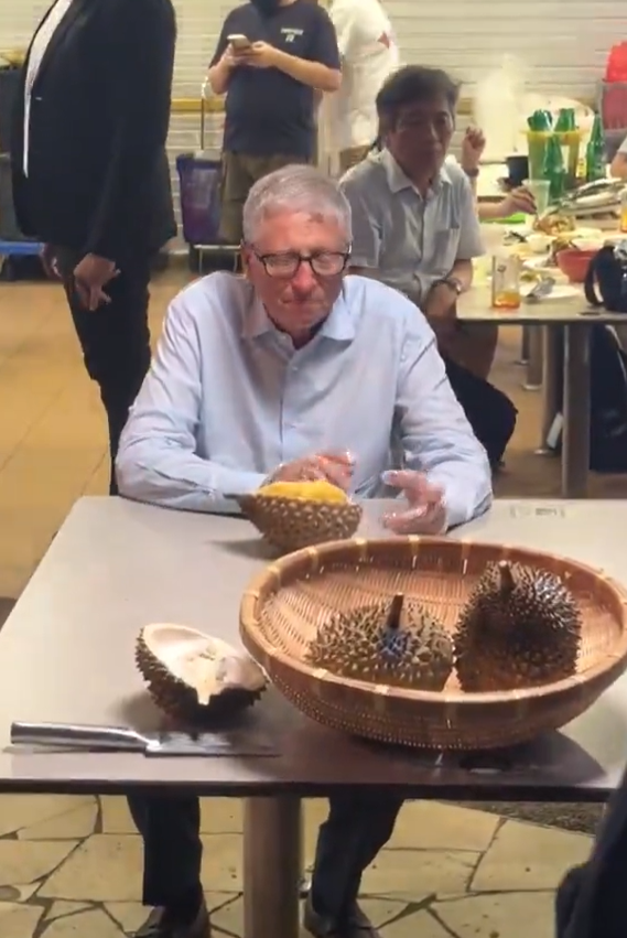 當天比爾蓋茲還在攝影團隊的記錄下,勇敢挑戰了東南亞水果之王「榴槤」,只見這位科技巨擘小心翼翼地品嚐後,臉上浮現明顯的糾結表情,還不斷聳肩,顯然對這獨特的口味不太能接受。