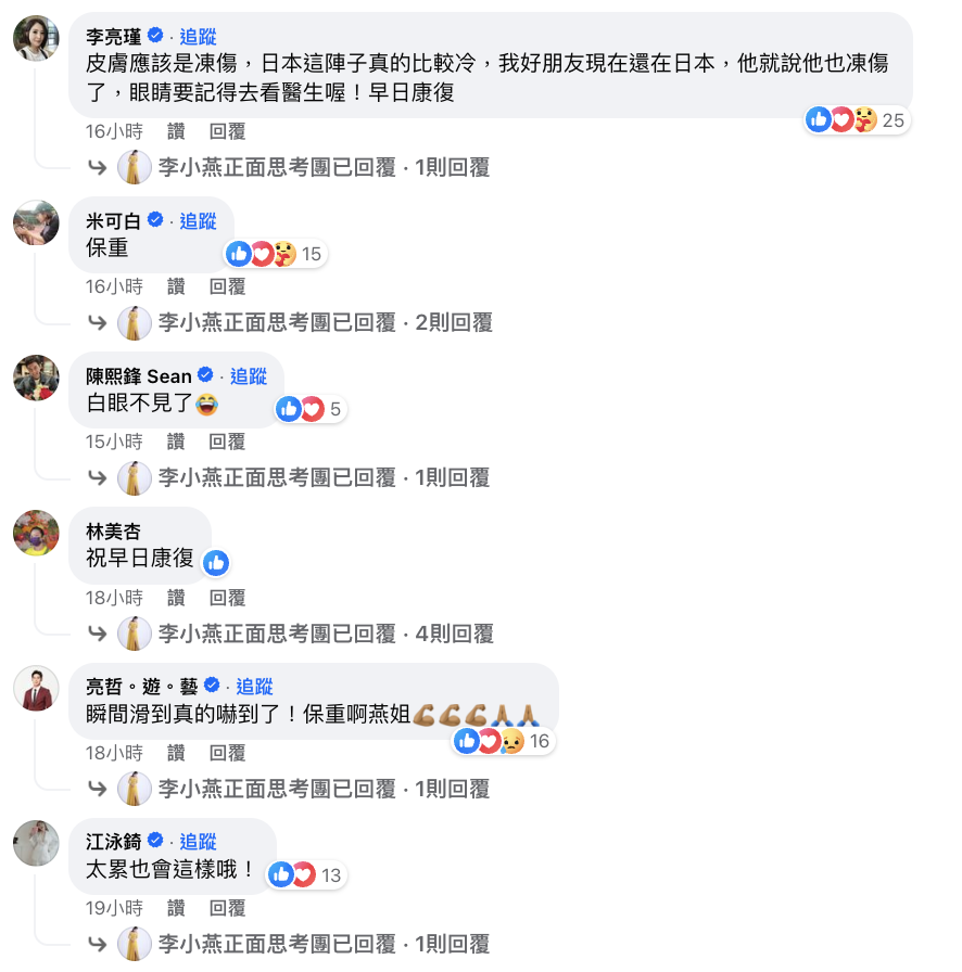 儘管如此,李燕還是開心表示:「即便如此,依然不減旅程的愉悅感!」畫面曝光後,仍引發外界擔憂,演藝圈好友及粉絲紛紛留言關心:「皮膚應該是凍傷,日本這陣子真的比較冷,眼睛要記得去看醫生喔!早日康復」、「保重」、「白眼都不見了」、「瞬間滑到真的嚇到了!保重啊燕姐」、「太累也會這樣哦!」、「多保重!多休息!早日康復」