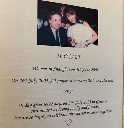 從曬出的畫面可以看到,照片是楊紫瓊和尚陶德聚會的甜蜜畫面,卡片上面還寫著「我們2004年6月4日在上海相識,2004年7月26日,尚陶德向楊紫瓊求婚,她說好。在6992天之後,7月27日在日內瓦,我們在家人朋友的陪伴下,一起慶祝了這個特別時刻。」