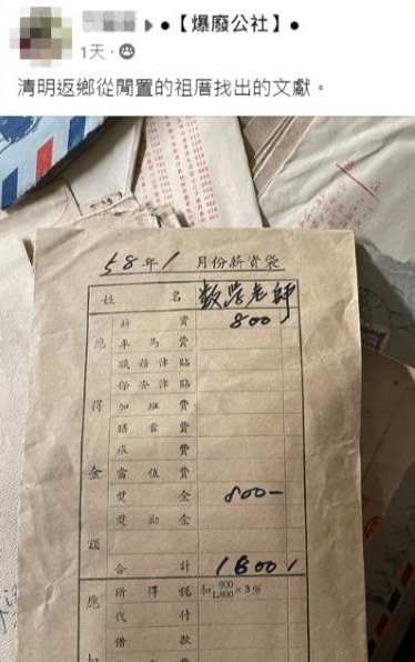 據《TVBS》報導,原PO寫道:「清明返鄉從閒置的祖厝找出的文獻。」並一連PO出好幾張照片,分別是愛國獎券、學生月票、薪資袋,以及在學證明書,斑駁泛黃的照片、充滿懷舊感,瞬間就把許多網友拉回五、六零年代。當年的薪資不像現在匯款入帳,大多以信封袋發放,上面清楚寫著「數學老師、薪資800元、獎金800元,合計1600元。」