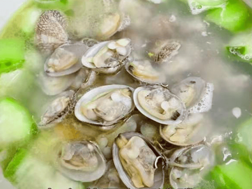 5、把花甲放入絲瓜雞蛋湯里煮沸,下入少許的鹽調味即可。