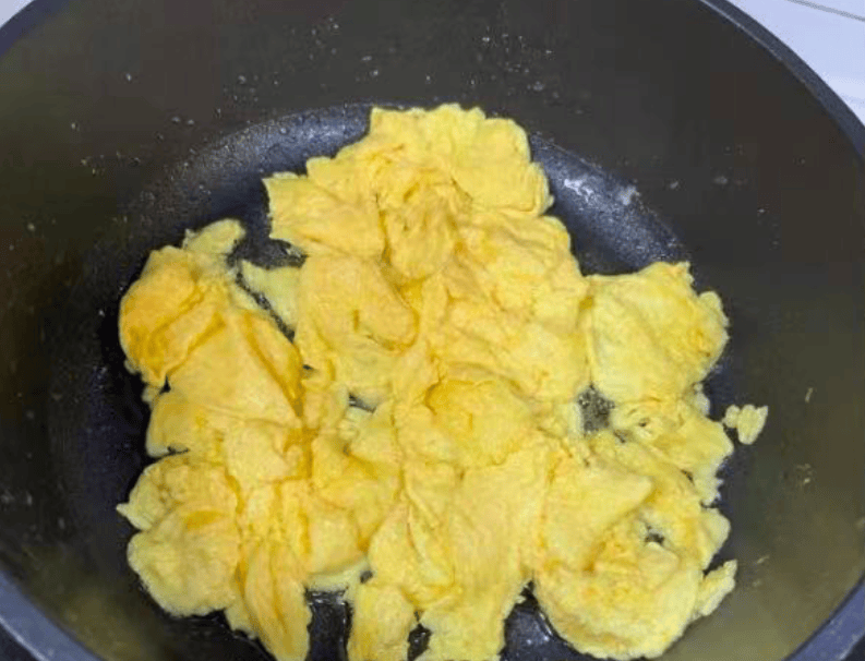 2、熱鍋涼油,下入雞蛋液煎至凝固起鍋待用。