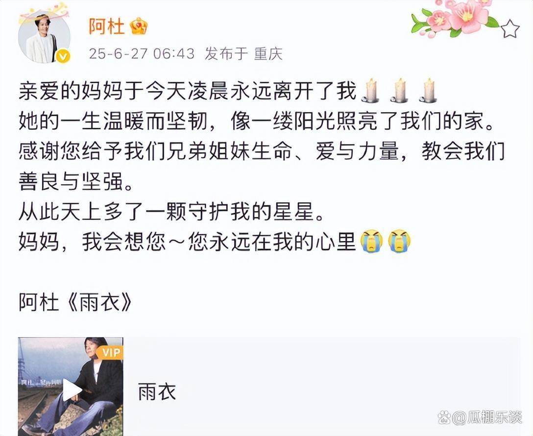 6月27號,歌手阿杜在社交平台上發文官宣,他媽媽去世了。