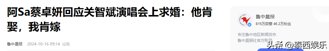 魯中晨報2024-10-16——阿Sa蔡卓妍回應關智斌演唱會上求婚:他肯娶,我肯嫁