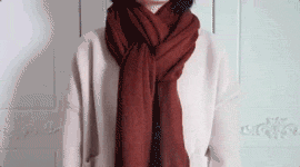 對摺圍巾後繞在脖子上,把一邊圍巾穿過小洞,翻轉小洞一下,把另一邊圍巾再穿過小洞,整理整理,完成!