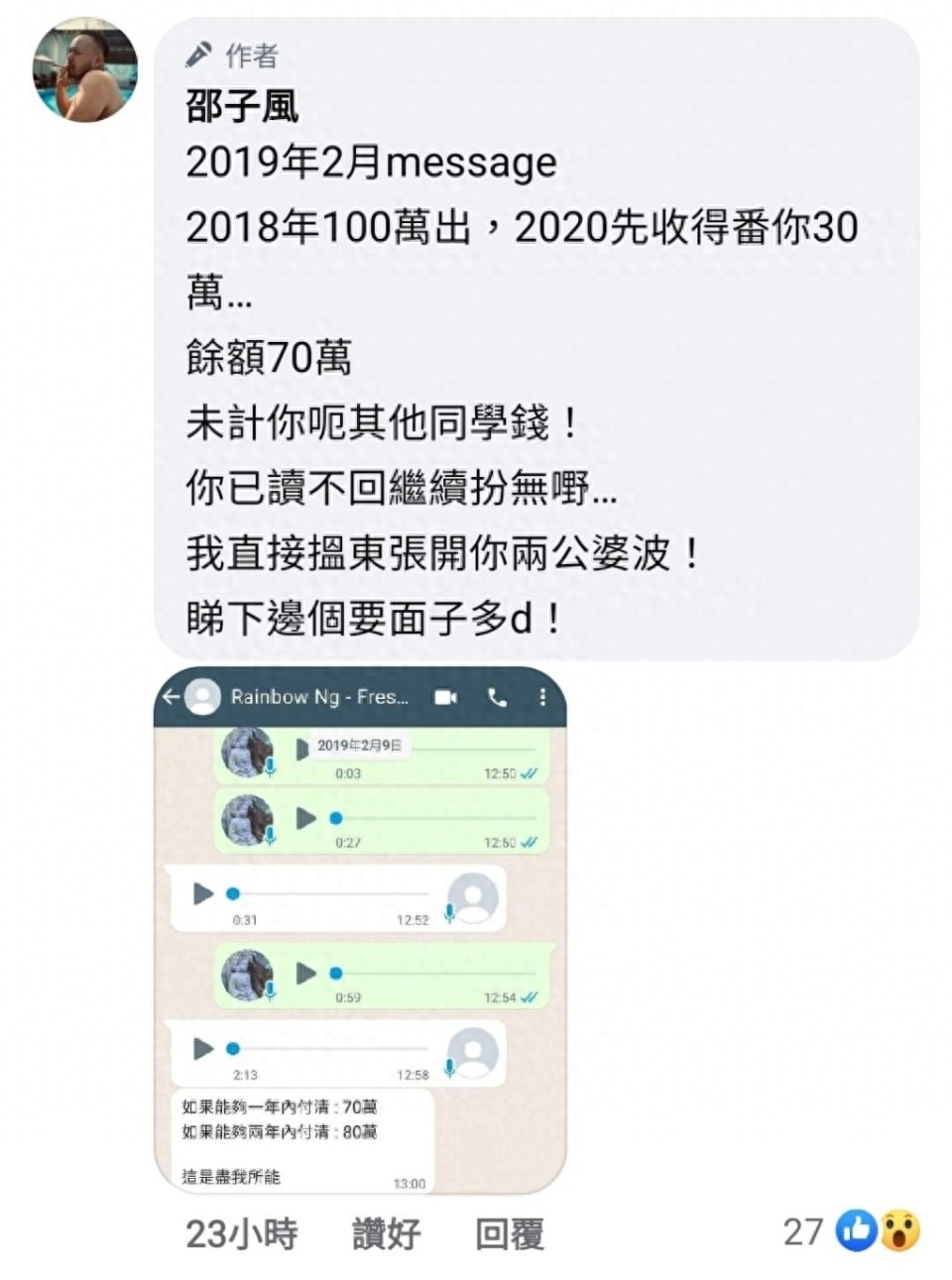伍惠寶在邵子風的追債帖子下留言,澄清所謂的債務其實是邵子風的投資金額,證實雙方確實有金錢往來。她強調,邵子風在五年前主動向她提出投資,並要求在她的公司做市場營銷,月薪三萬港元。然而,不久后,邵子風又要求取回所有投資的金額,對她提出了諸多指責。