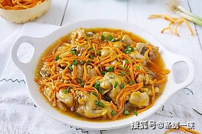 2、雞肉清洗乾淨剁成小塊,加入一點澱粉,抓洗乾淨後用廚房紙吸乾水分,再放入香菇、薑絲、蔥白、蟲草花、紅棗、生抽、蠔油、老抽、料酒、食用油、白糖、食鹽和白鬍椒粉,抓拌均勻腌制十分鐘。